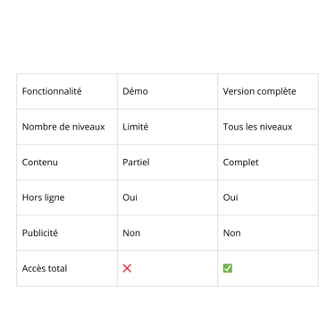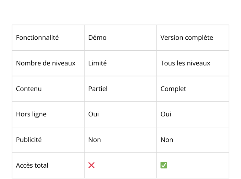 La version complète débloque tous les niveaux, le contenu intégral et l’accès hors ligne, sans publicité.